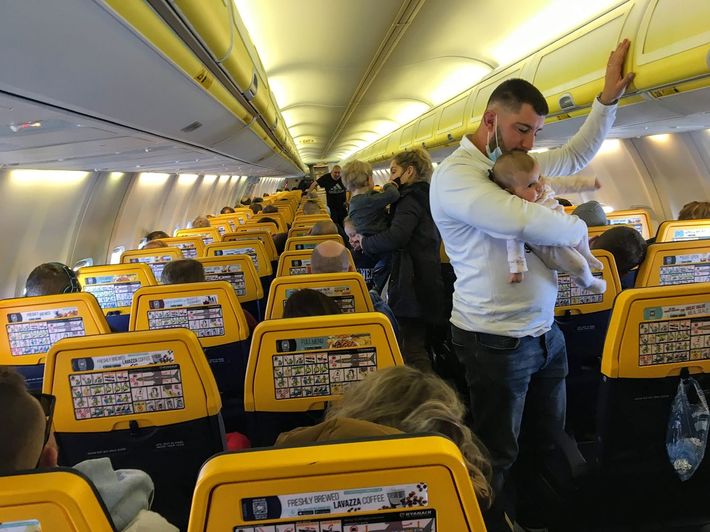 欧州内を飛ぶフライトはどの区間もほぼ満席で飛んでいる(4月4日LCCライアンエアー機内にて)