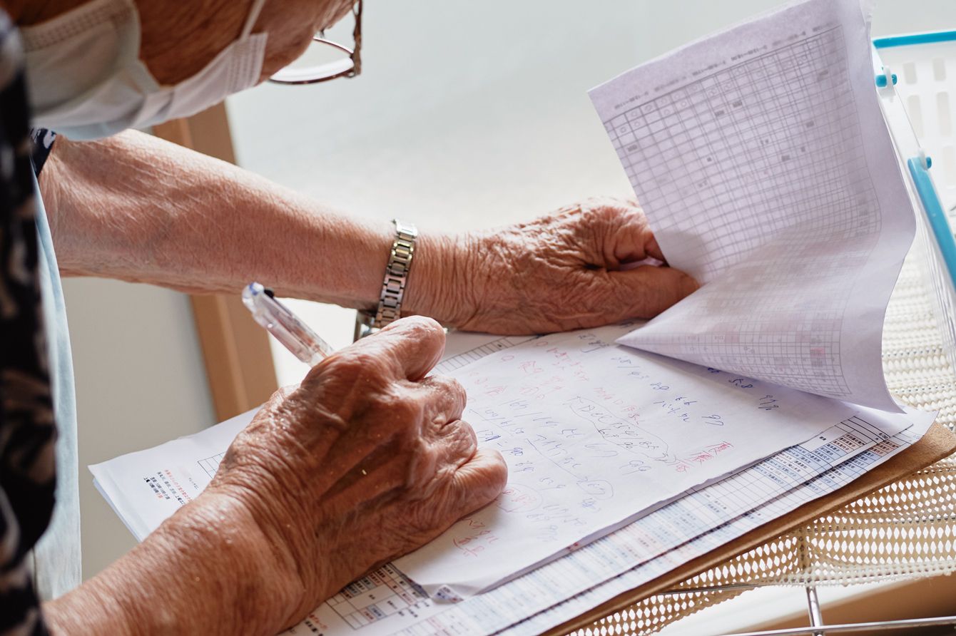 現在勤務するサービス付き高齢者向け住宅で。入居者さんの様子はこまめにメモに記録する。