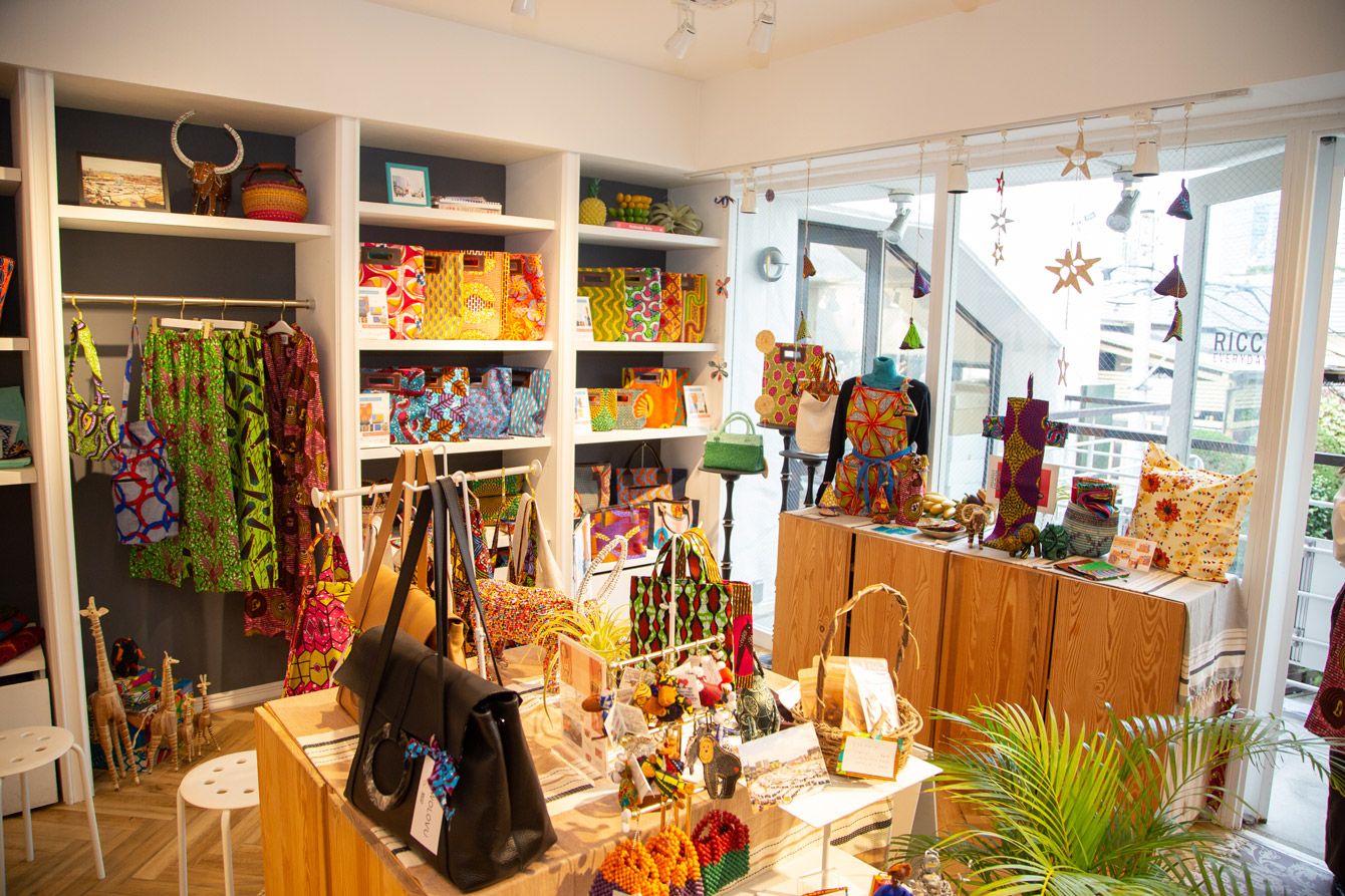 仲本千津さんが経営する代官山の直営店「RICCI EVERYDAY」には、鮮やかなアフリカンプリントの製品が並ぶ。