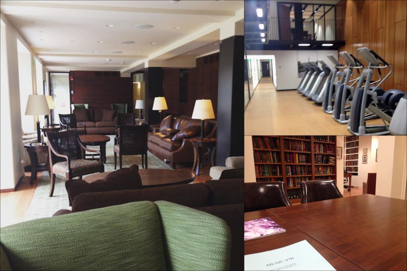 寮のロビーとジム、図書館。寮は廣津留さんの在学中にリニューアルし、ホテルのような雰囲気だった。