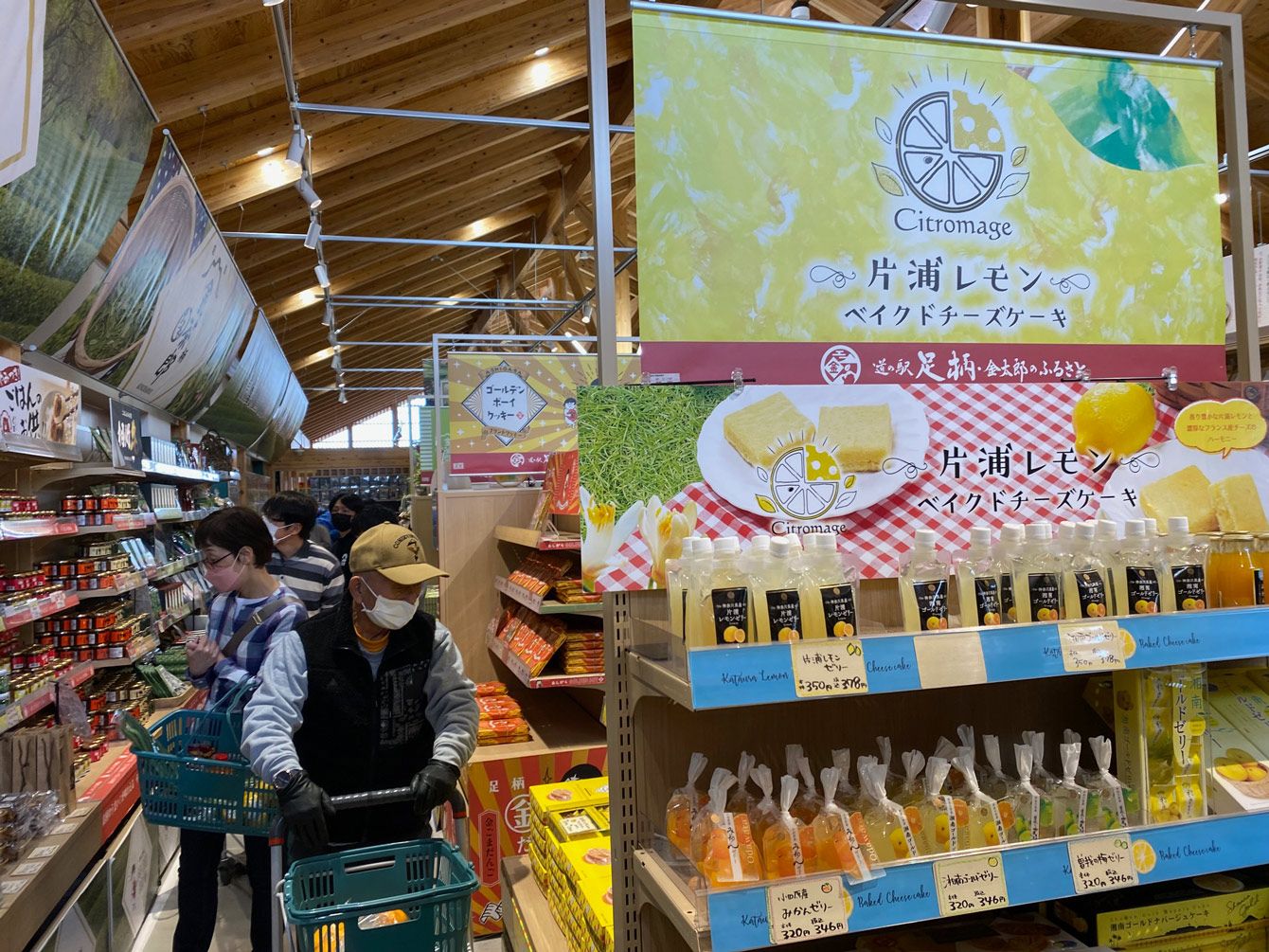 明るい店内で農産物やお土産を買い物する利用客