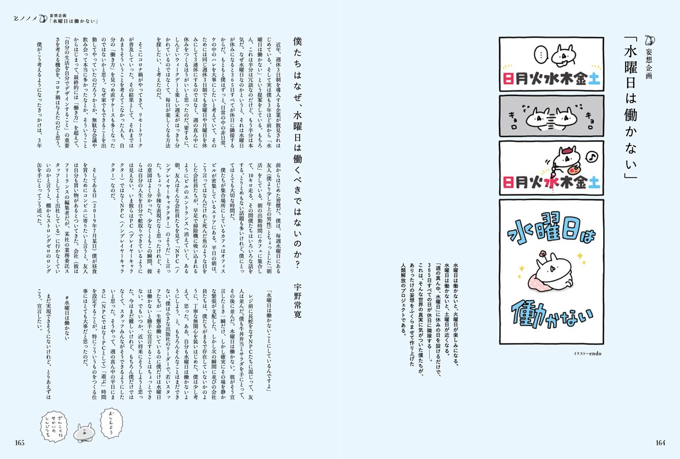 【妄想企画】水曜日は働かない:週の真ん中、水曜日が休みになると1年365日がすべて休日に隣接する──この宇宙の真実に気づいた宇野の提言をめぐって、あらゆる手段でその実現を検討する小特集。この5月にはホーム社より宇野による