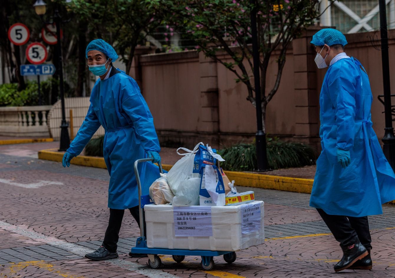 2022年4月23日、中国上海で、ロックダウン(都市封鎖)下の住民のための食料を運ぶ人。