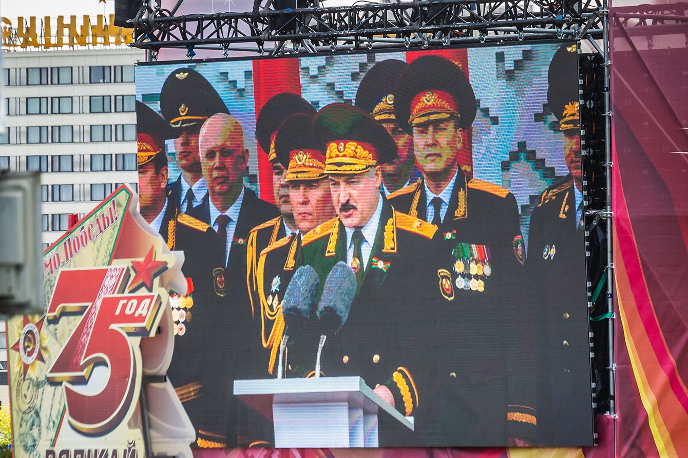 大祖国戦争での勝利75周年を祝うパレードで演説するルカシェンコ大統領=2020年5月9日、ベラルーシ・首都ミンスク