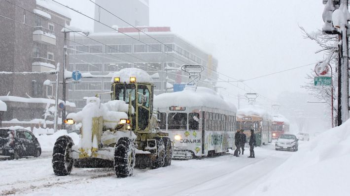 大雪に見舞われ運休となり、線路上の除雪作業を待つ路面電車の列=2021年1月8日午後、JR富山駅前