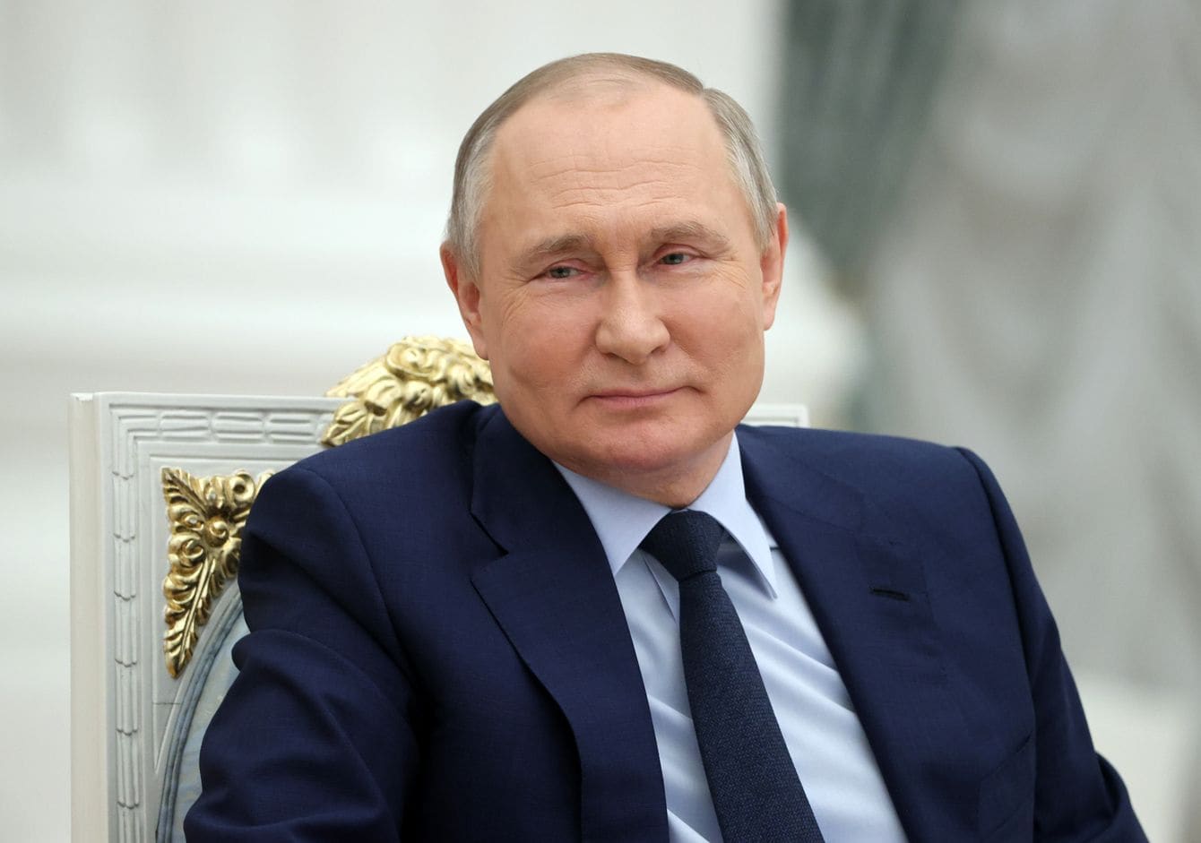 2022年4月20日、ロシア・クレムリンのエカテリーナ・ホールで会議を開くウラジーミル・プーチン大統領。
