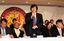 新日本プロレスの会見で話すブシロードの木谷高明社長(前列中央)。同左は坂口征二相談役、同右はユークスの谷口行規社長=2012年1月31日、明治記念館