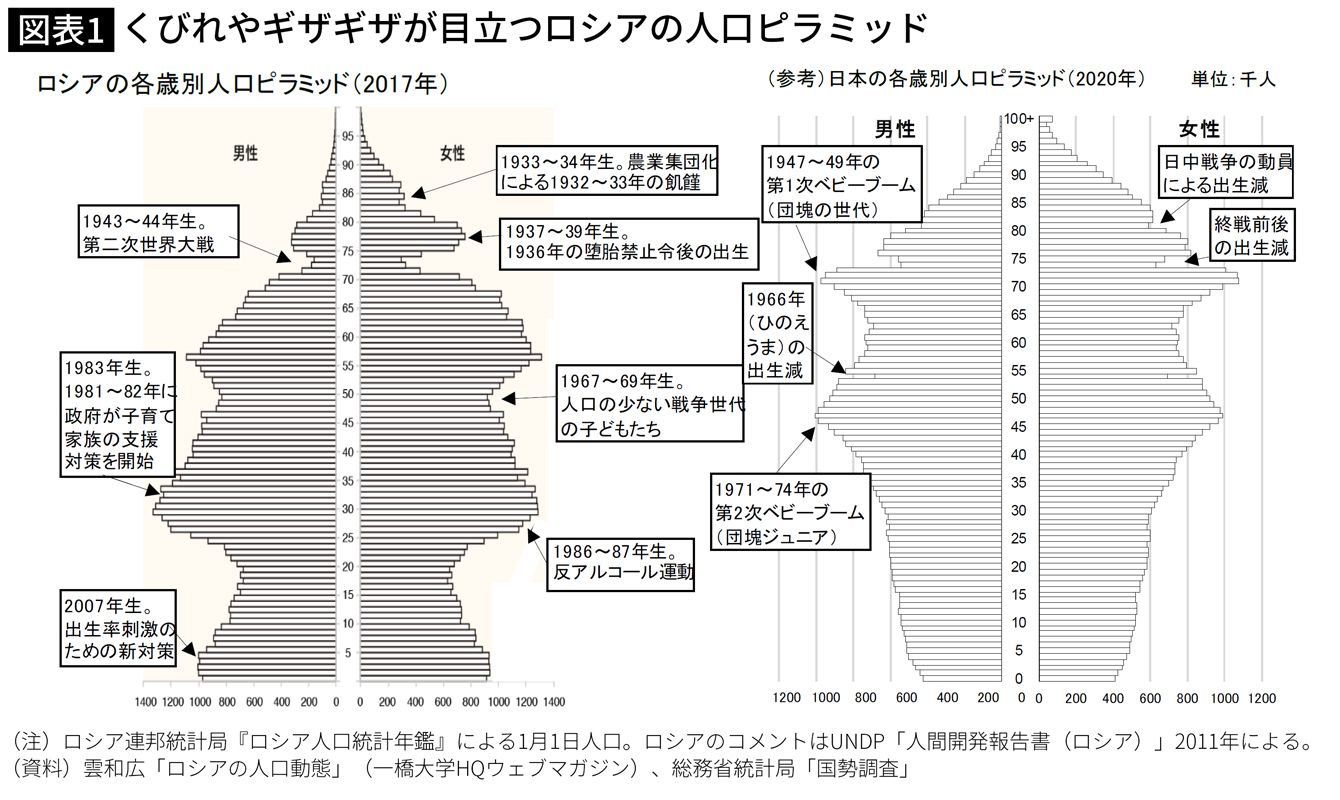 「異様な"クビレ"がロシアの証し」人口ピラミッドに見る夥しい死者数と今なお短い寿命が示す怖い歴史