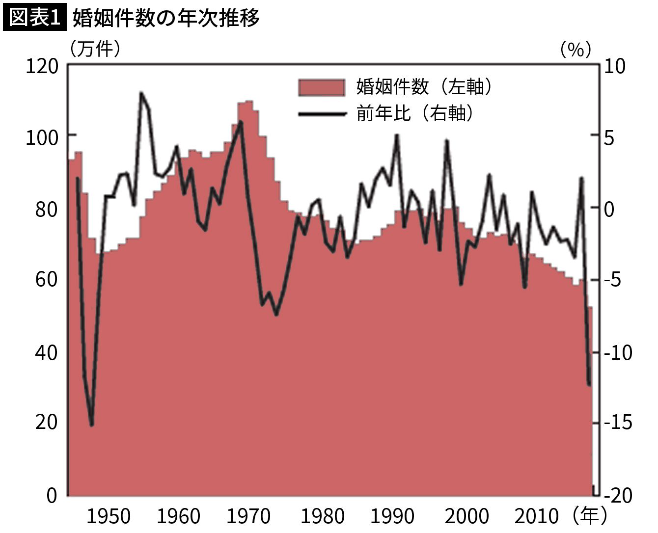 厚生労働省「人口動態統計」のデータを基に株式会社マネネが作成。(注):折れ線は前年比。