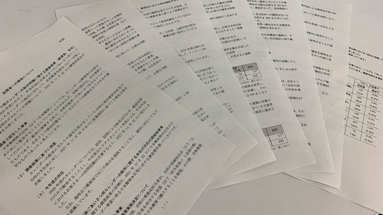 日本郵便が1月に公表した調査報告書。個人情報の問題は2ページしか記載がない