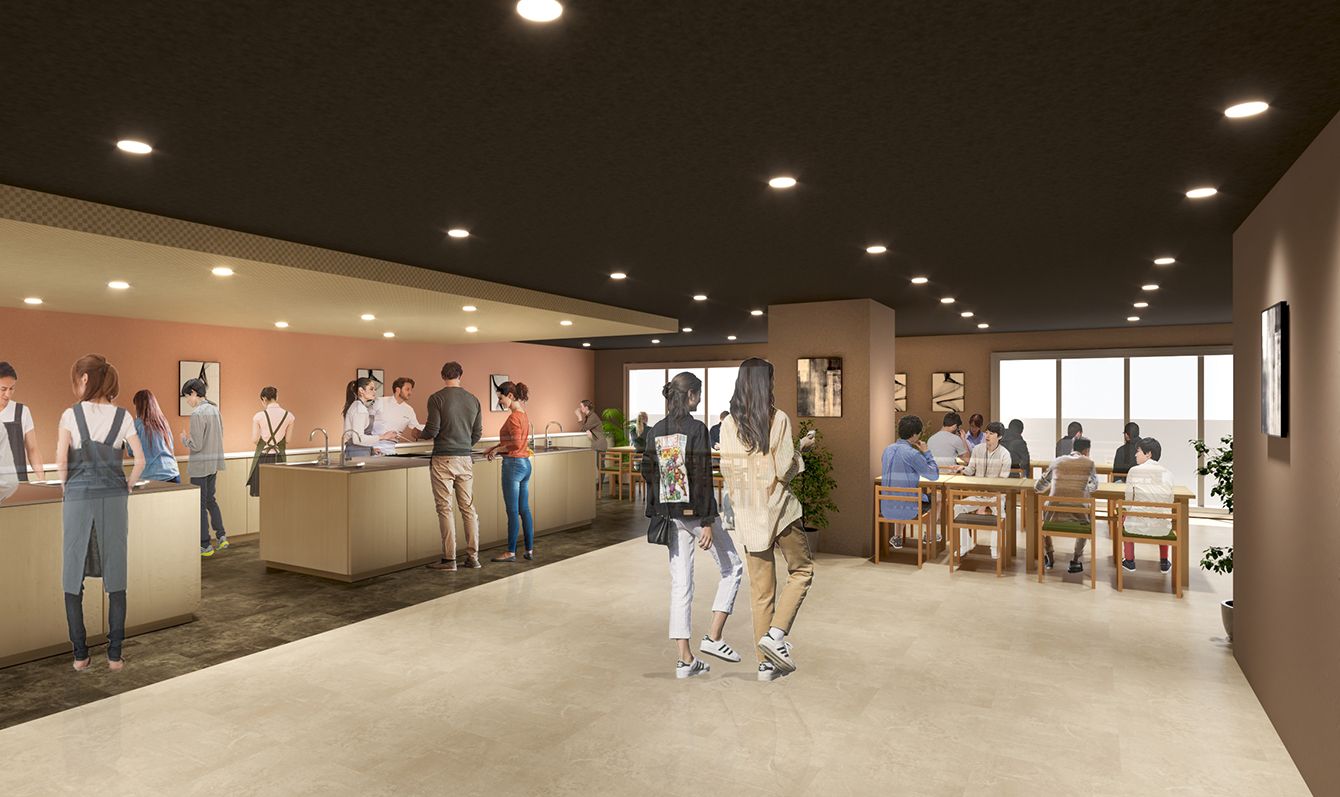 『ドーミー』学生寮の共用キッチン及びダイニングルームのイメージ。