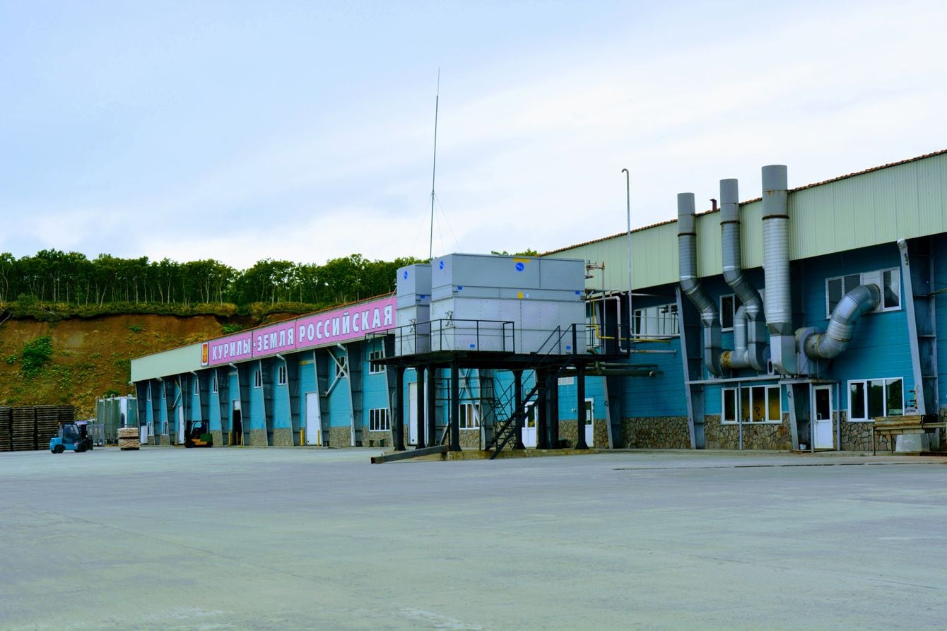 択捉島の財閥ギドロストロイが所有する魚介加工工場。看板に「クリル(北方領土)はロシアのもの」と書かれている