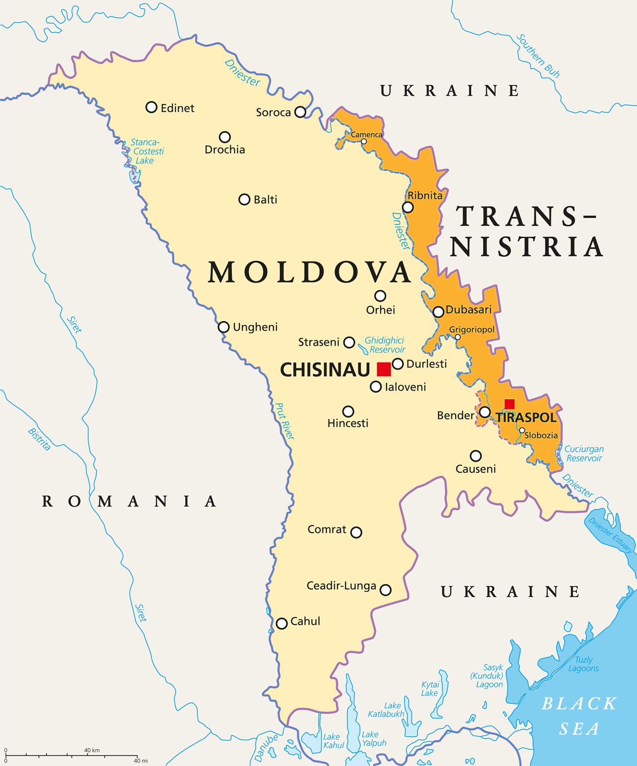モルドバの地図。オレンジ色部分の地域が、モルドバから一方的に独立を宣言している「沿ドニエストル共和国」。ロシア軍が平和維持軍の名で駐留している。