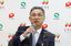 記者会見する川越浩司きらやか銀行頭取=2022年5月13日午後、山形市