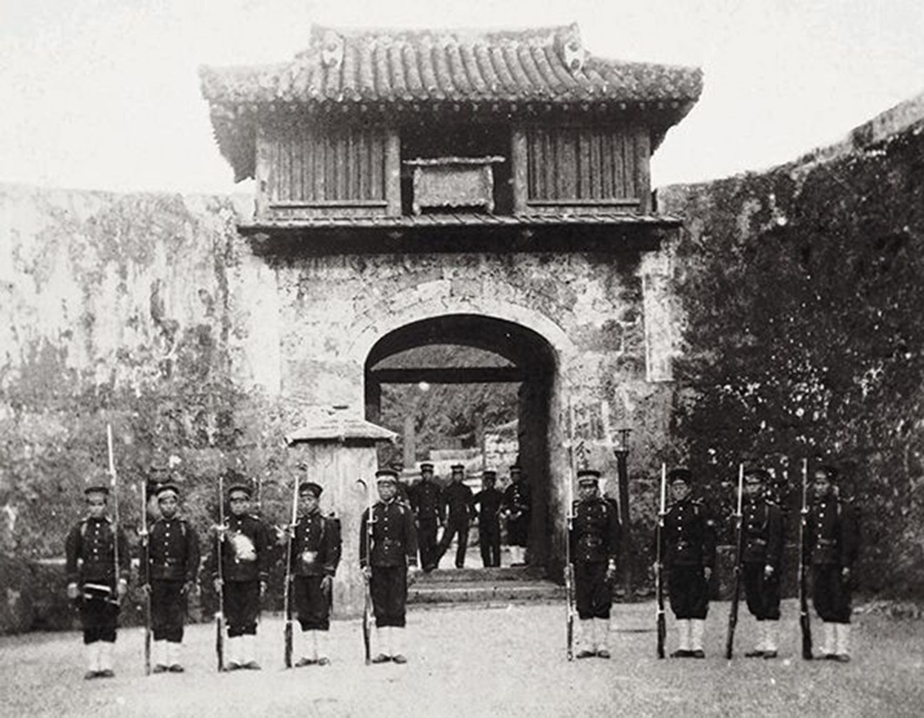 首里城歓会門前に並ぶ明治政府軍の兵士(写真=PD-Japan-oldphoto/