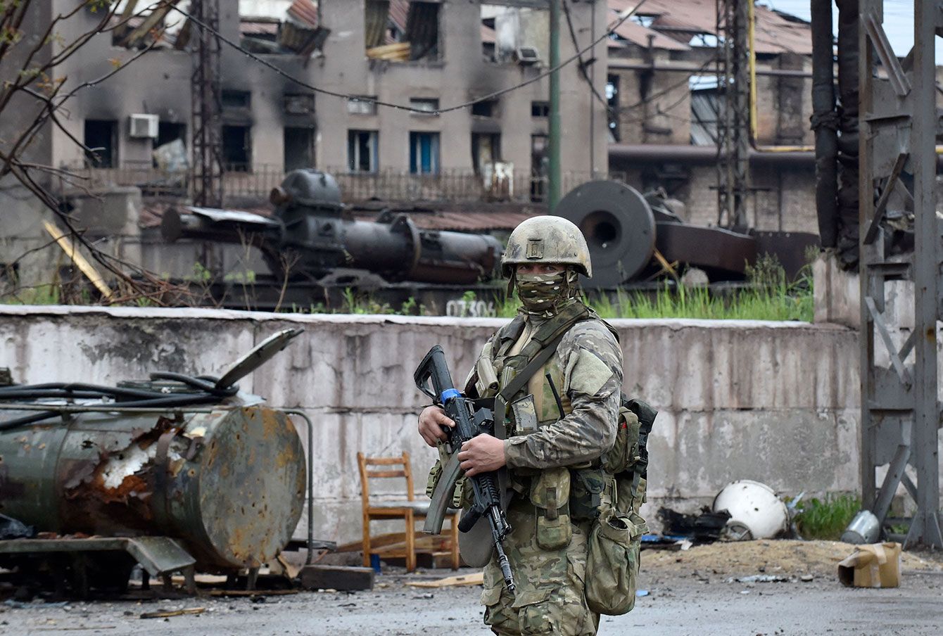 ウクライナ南東部マリウポリで、警備に当たるロシア軍兵士=2022年5月18日(ロシア軍主催のメディアツアーで撮影)