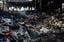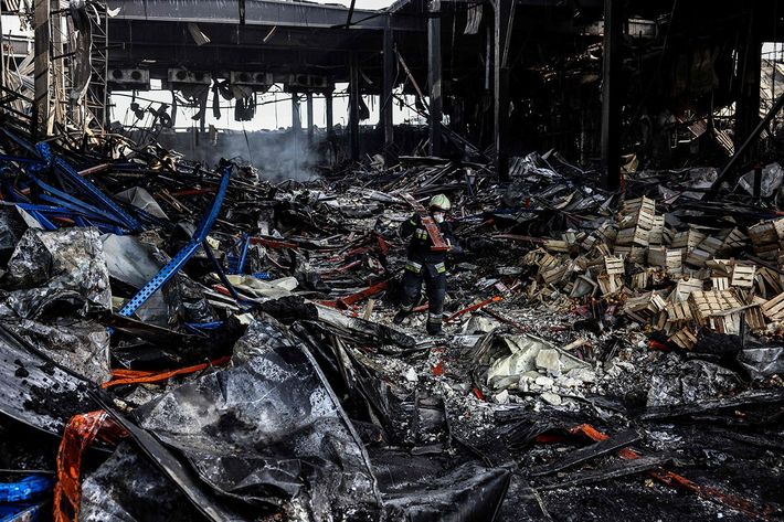 ロシア軍の攻撃で破壊された食料庫の残骸=2022年3月29日、ウクライナ・ブロバルイ