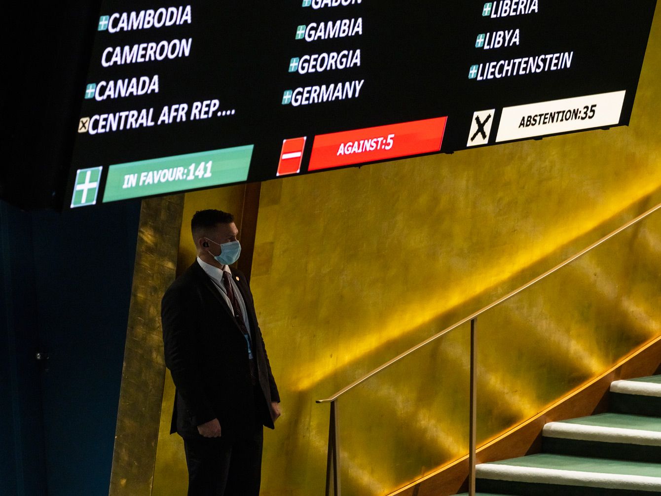 2022年3月2日、ロシアによるウクライナ侵攻を受けて開かれた国連の緊急特別総会で、ロシアに軍事行動の即時停止を求める決議が加盟国193カ国中141カ国の賛成によって採択された(ニューヨークの国連本部の総会ホールにて)。