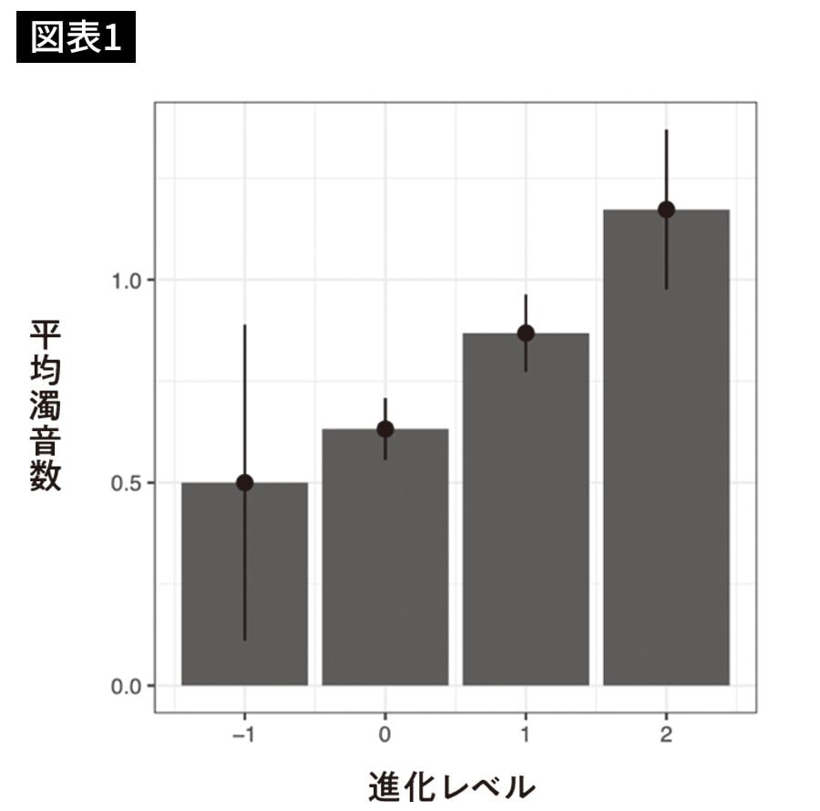 それぞれの進化レベルにおいて、名前に含まれる濁音数の平均。ポケモンは2回まで進化する。「-1」は後から登場した「ベイビィポケモン」。Kawahara et al. (2018)より編集して転載。/『
