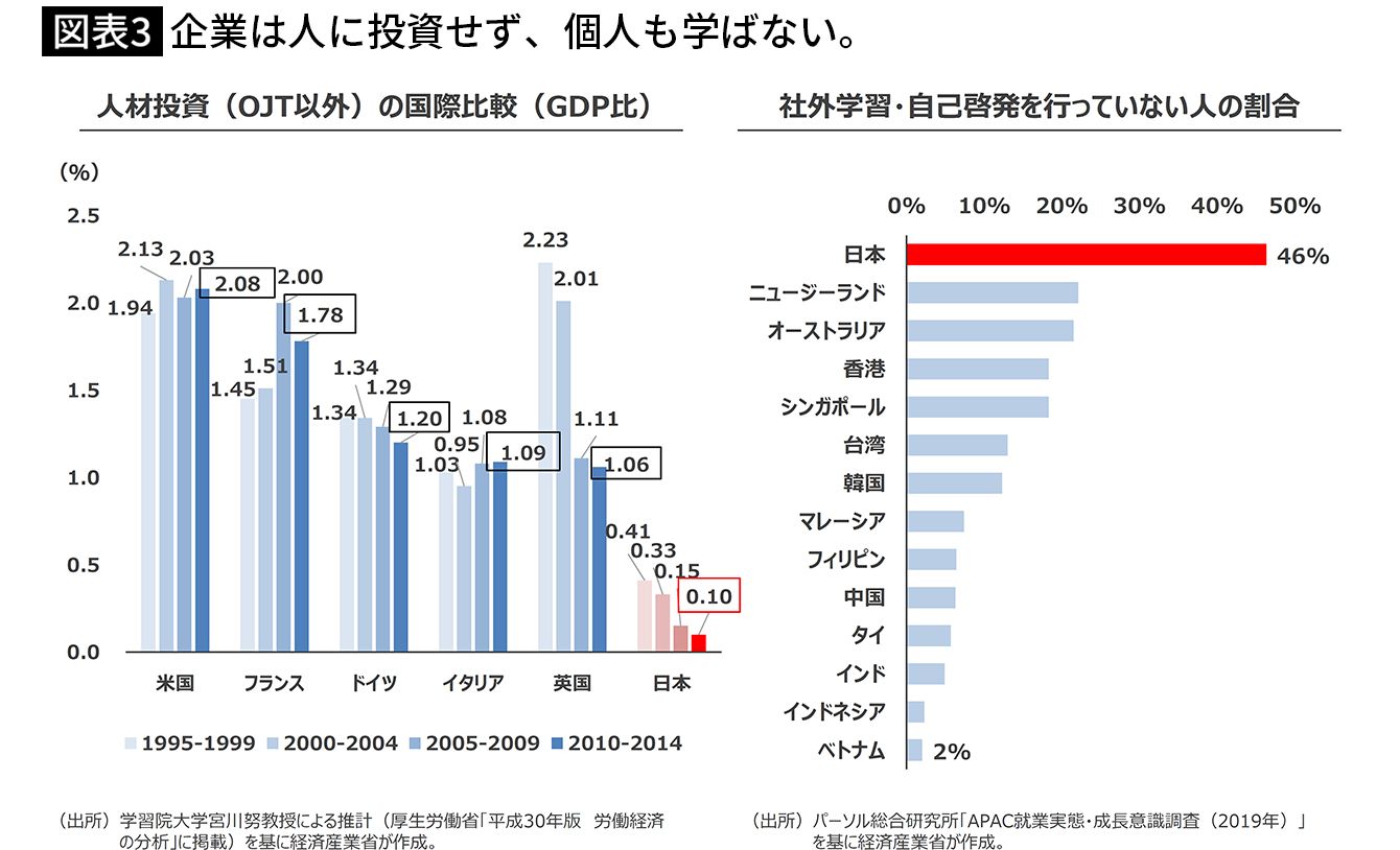 日本の人材投資は先進国の中でも少なく、社外学習や自己啓発を行っていない人も多い(出所=「