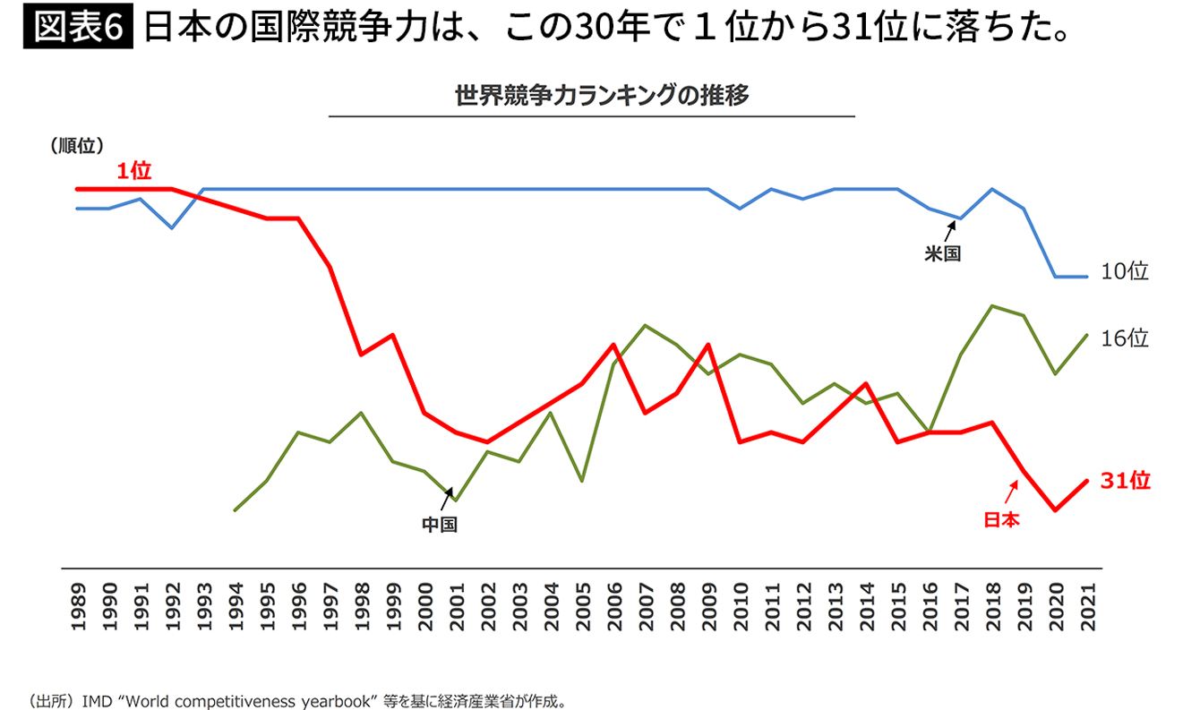 日本の国際競争力は、この30年で1位から30位以下に転落(出所=「