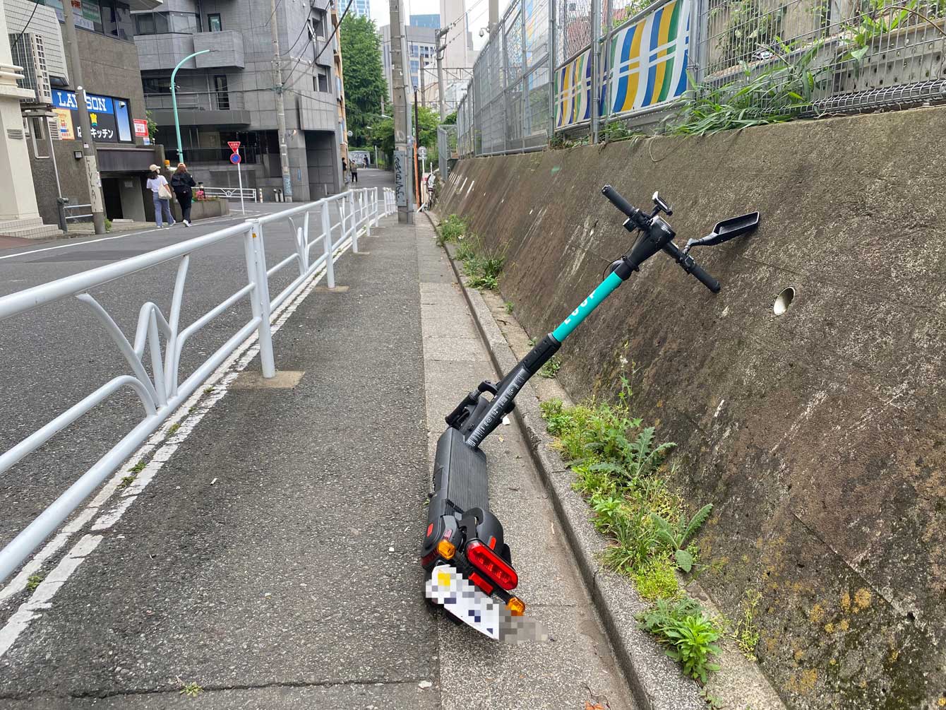 乗り捨てられていたキックボード。近くにいた作業員によると早朝から放置されていたという