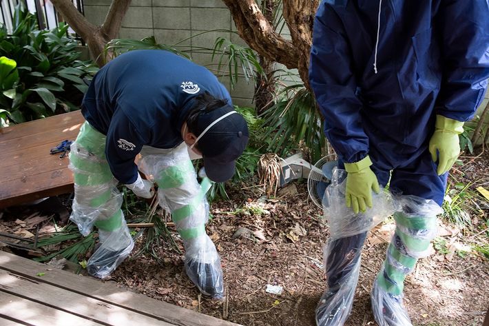 作業中のケガを防ぐため、とくに下半身は厳重に守ってから現場に入る。