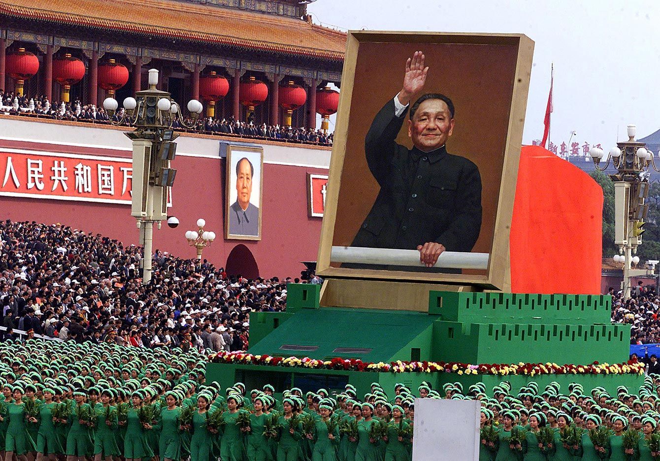 北京で行われた国慶節のパレードで、天安門前を行進する故鄧小平氏の肖像画=1999年10月1日、中国・北京