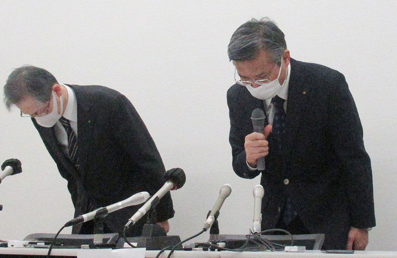 行政処分を受け、陳謝する小林化工の小林広幸社長(右)ら=2021年2月9日、福井県あわら市