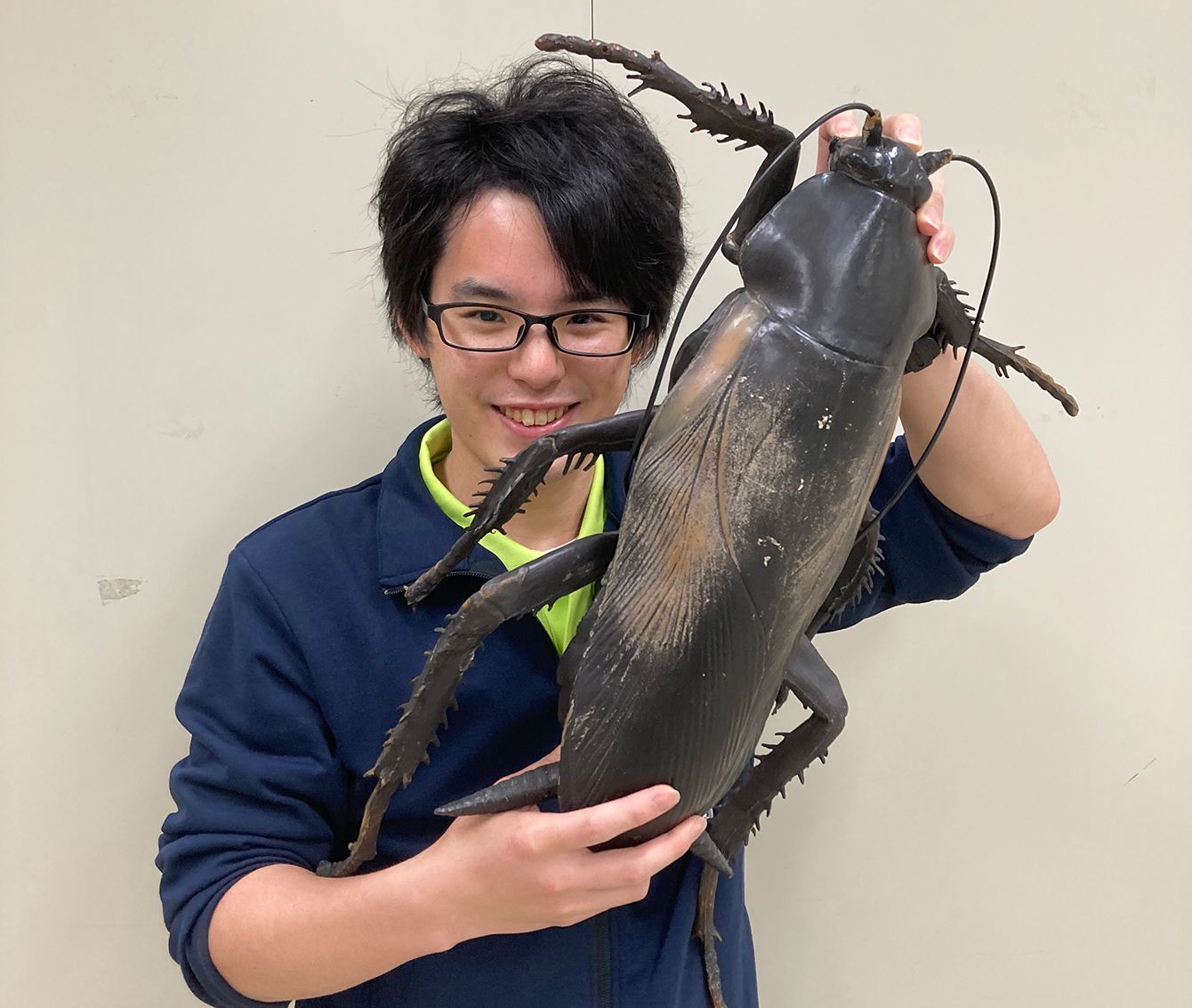 愛するゴキブリの巨大模型を持つ筆者