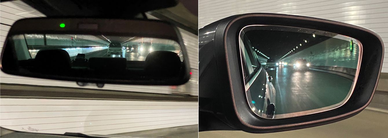 バックミラーとドアミラーから見える周囲のクルマの様子。ヘッドライトを点けないクルマはトンネルの中では目立たない