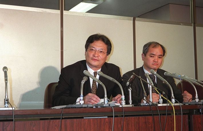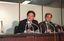 2000年7月25日、オウム真理教の端本悟被告の死刑判決後に記者会見する坂本堤弁護士元同僚の岡田尚弁護士(左)と武井共夫弁護士(東京・霞が関の司法クラブ)