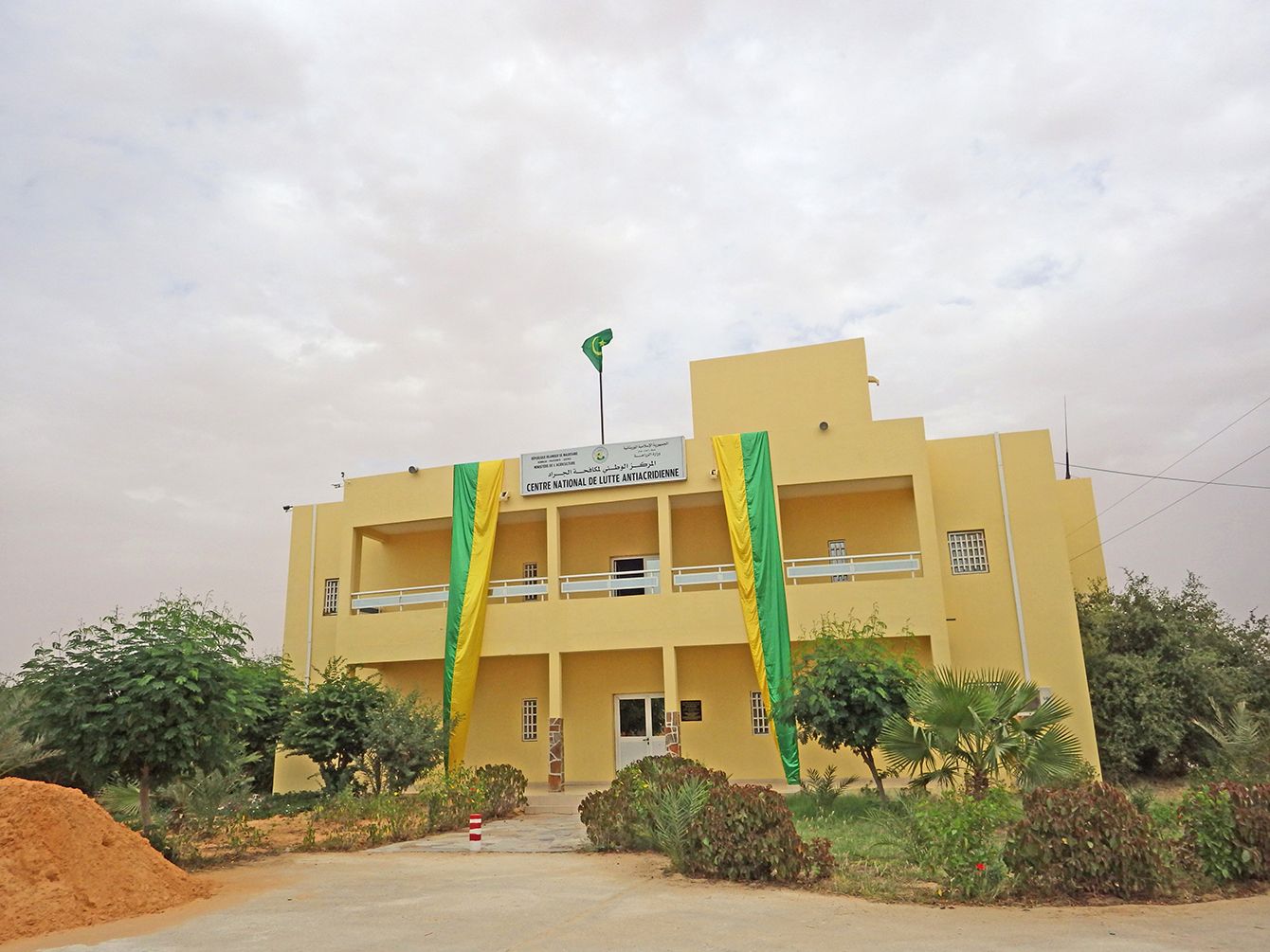 研究所にお越しいただいた在モーリタニア日本大使館東博史大使(右)と、モーリタニア国立サバクトビバッタ研究所のババ所長(中)、モーリタニアの民族衣装をまとった著者(左)