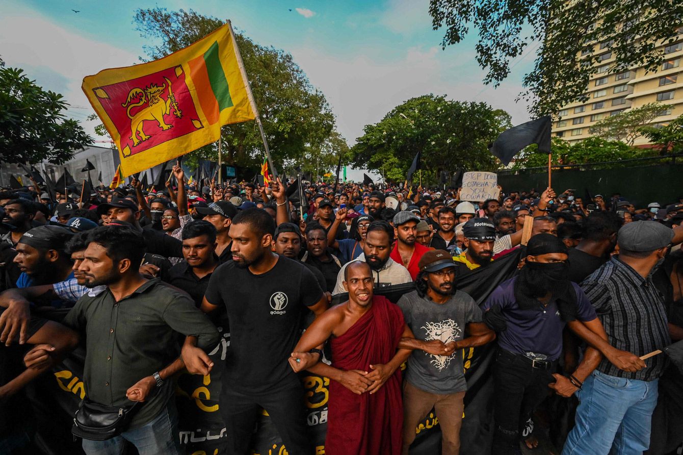 2022年5月28日、コロンボで、スリランカの深刻な経済危機をめぐり、ゴタバヤ・ラージャパクサ大統領の辞任を求める反政府デモの50日目に、デモ参加者がスローガンを叫ぶ。