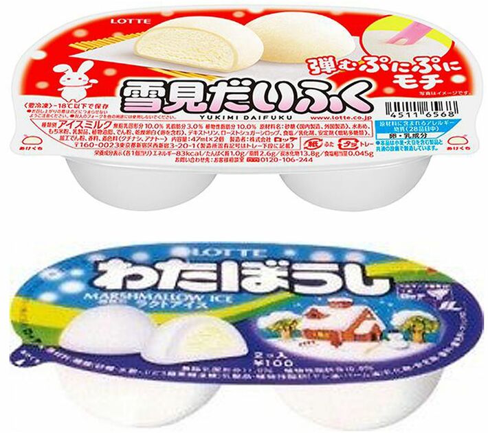 雪見だいふく(2022年春、上)と1980年に発売されたアイスをマシュマロで包んだ「わたぼうし」(下/現在は販売終了)(写真提供=ロッテ)