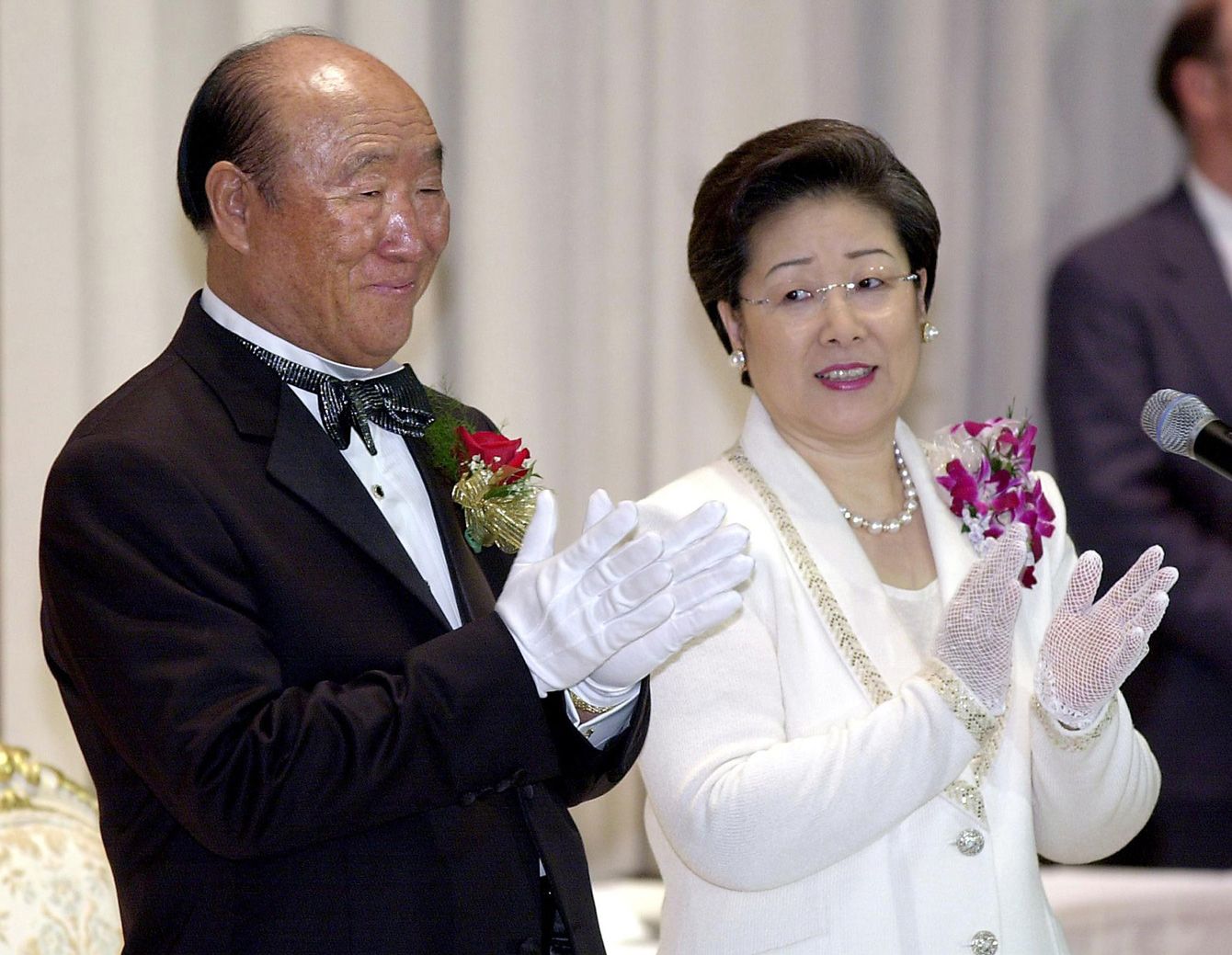 2001年5月27日、ニューヨークのヒルトンホテルで行われた集団結婚式で拍手する文鮮明氏(左)と妻の韓鶴子氏(右)。韓国出身の救世主と自称し、物議を醸す統一教会と自動車から寿司に至るビジネス帝国を設立した文氏が、2012年9月3日、92歳で死去。