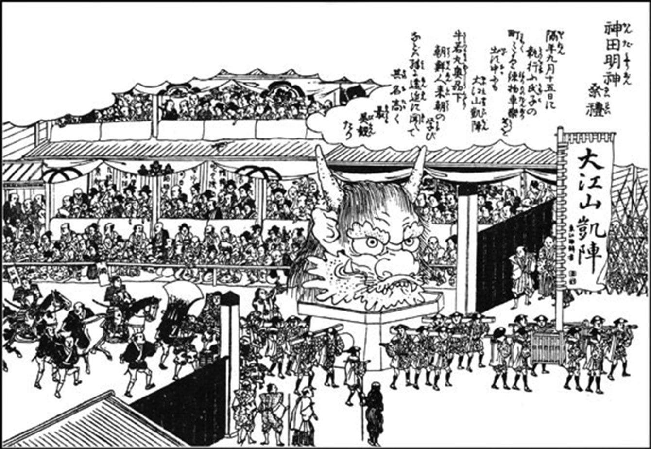 鬼退治をテーマにした造り物が定番に(「神田明神祭礼図」=国立国会図書館蔵)