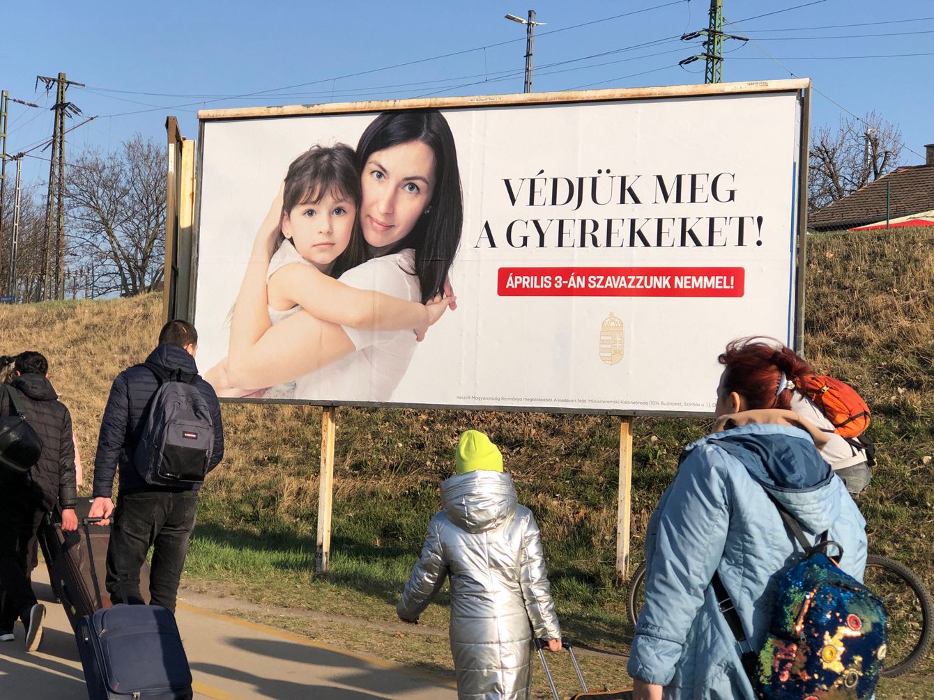 ハンガリー議会選挙に際して、多様性に関する国民投票が行われた。「未成年者に対して性転換手術(性別適合手術)を広めることに賛成しますか」など答えにくい設問が並んだ。写真のポスターはその際に町中に貼られていたもので、「子どもを守ろう」とだけ書いてある。