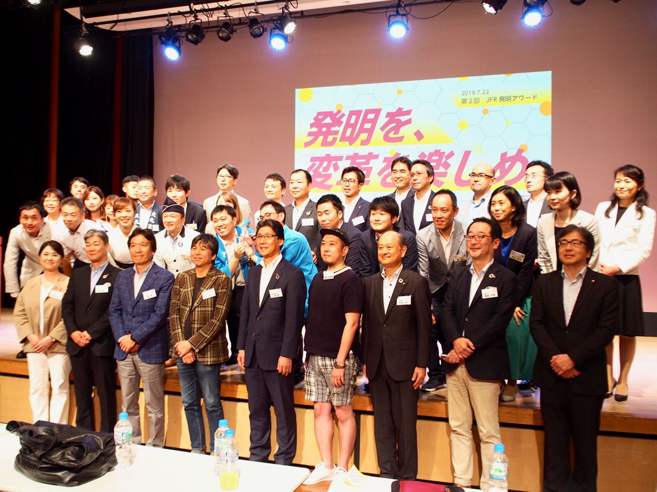 J.フロントリテイリングが2019年7月に開催した「JFR発明アワード2019」に、審査員として参加した若宮和男さん(前列右から4人目)。1人だけキャップに短パン姿だ。