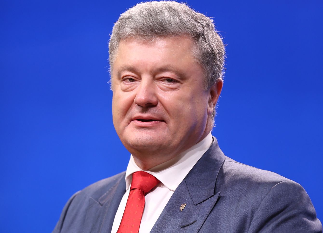 2018年7月9日、ベルギーのブリュッセルで開催されたEU・ウクライナ首脳会議内で共同記者会見を行うウクライナのペトロ・ポロシェンコ大統領