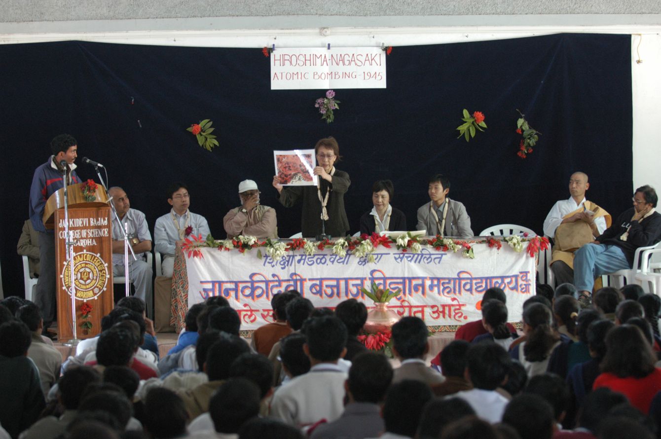 インドの大学で被爆体験の証言活動をする岡田恵美子さん(2005年)