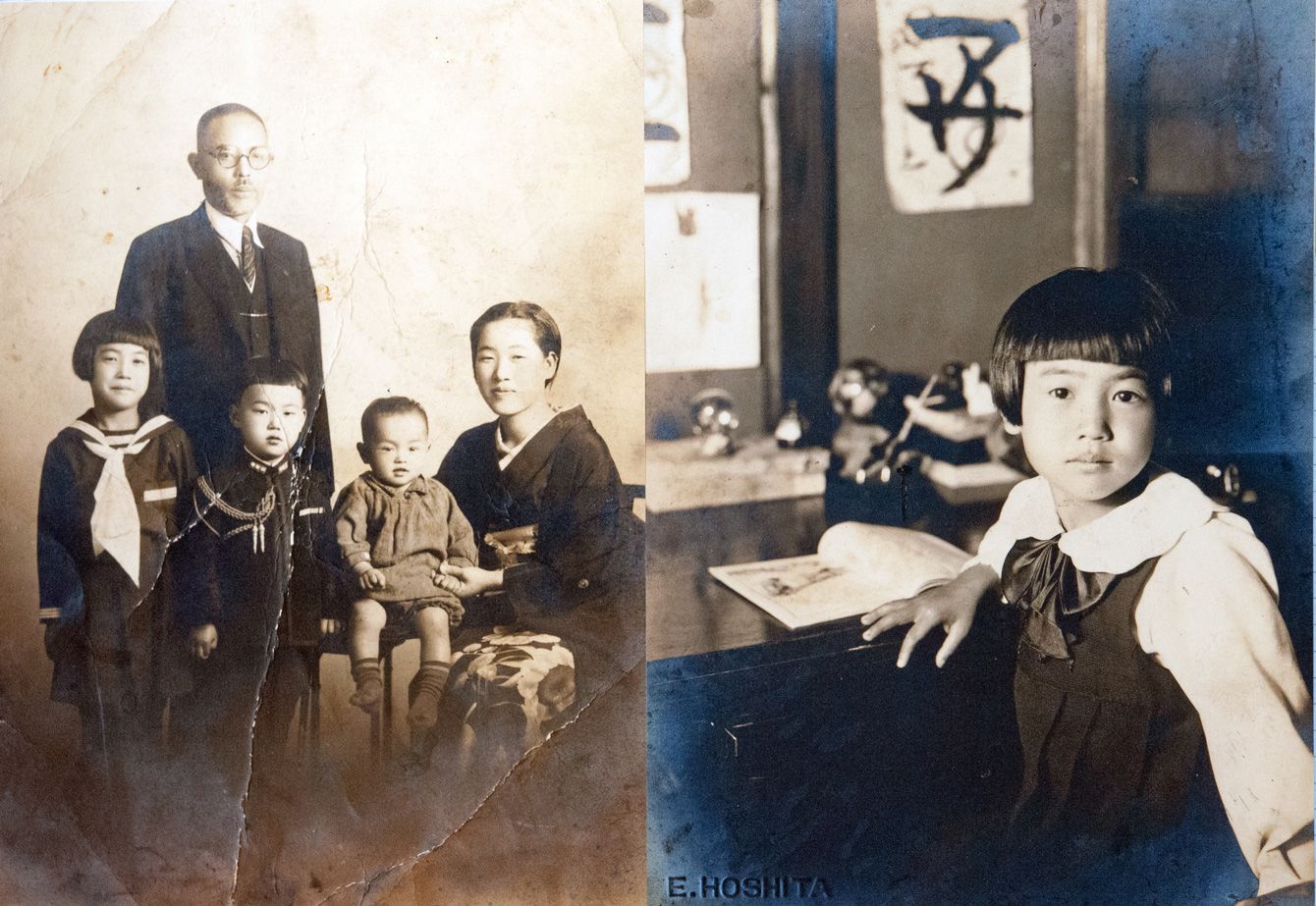 写真左/岡田(旧姓・中迫)美恵子さんの家族写真。前列左から2人目、海軍風の装いをしているのが美恵子さん。写真右/8月6日、学校に行ったきり、帰ってくることはなかった姉の中迫美重子さん