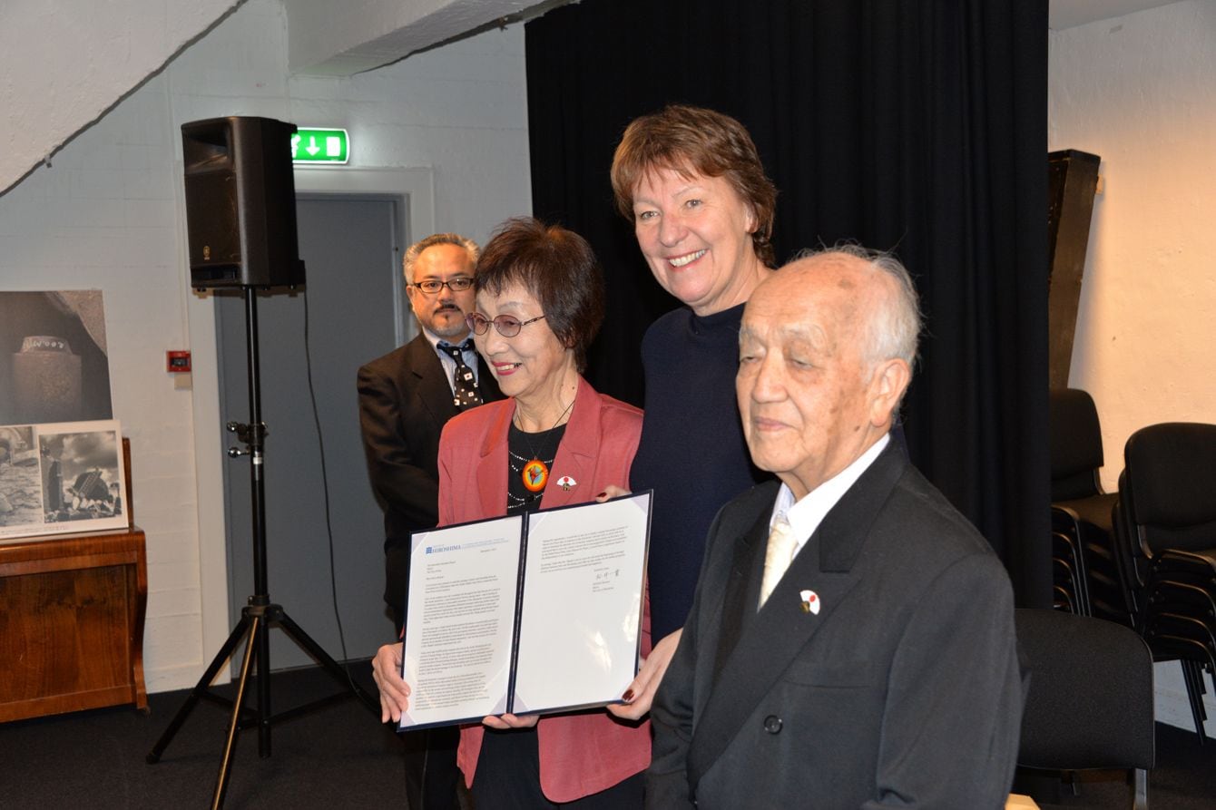 ノーベル平和賞の授賞式に招かれ、ノルウェー・オスロを訪れた岡田さん。左は被爆者の築城昭平さん(2015年)