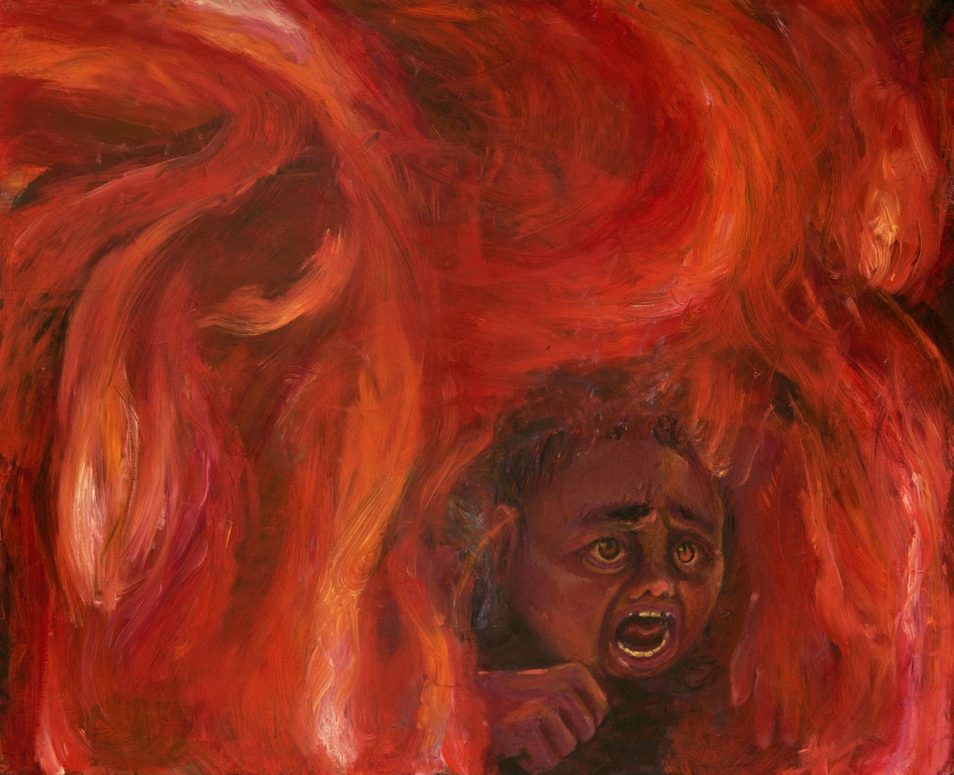 岡田さんの証言を基に高校生の岡島愛さんが描いた「炎の中で助けを求める女の子」