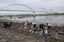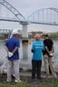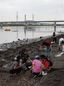 8月7日朝、江戸川の河畔でカキ殻を除去するさまざまな人たち。