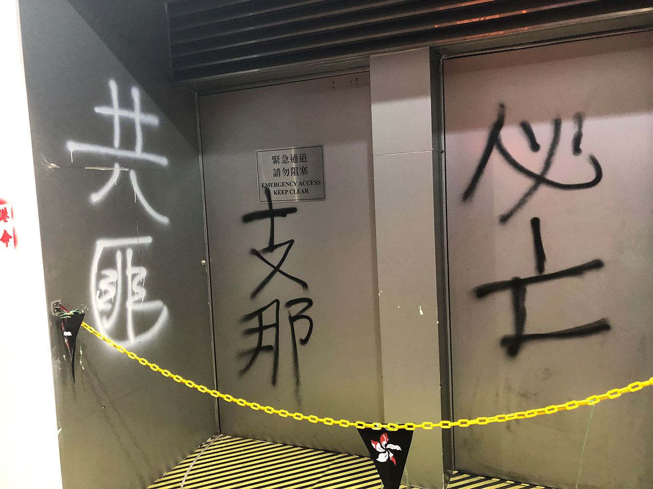 2019年10月1日、抗議デモが暴徒化した時期の香港島の中国建設銀行店舗。香港デモの過激派は不謹慎系のネットカルチャーとの親和性が強く、中国資本の商店破壊や写真のような落書きをしばしばおこなった。