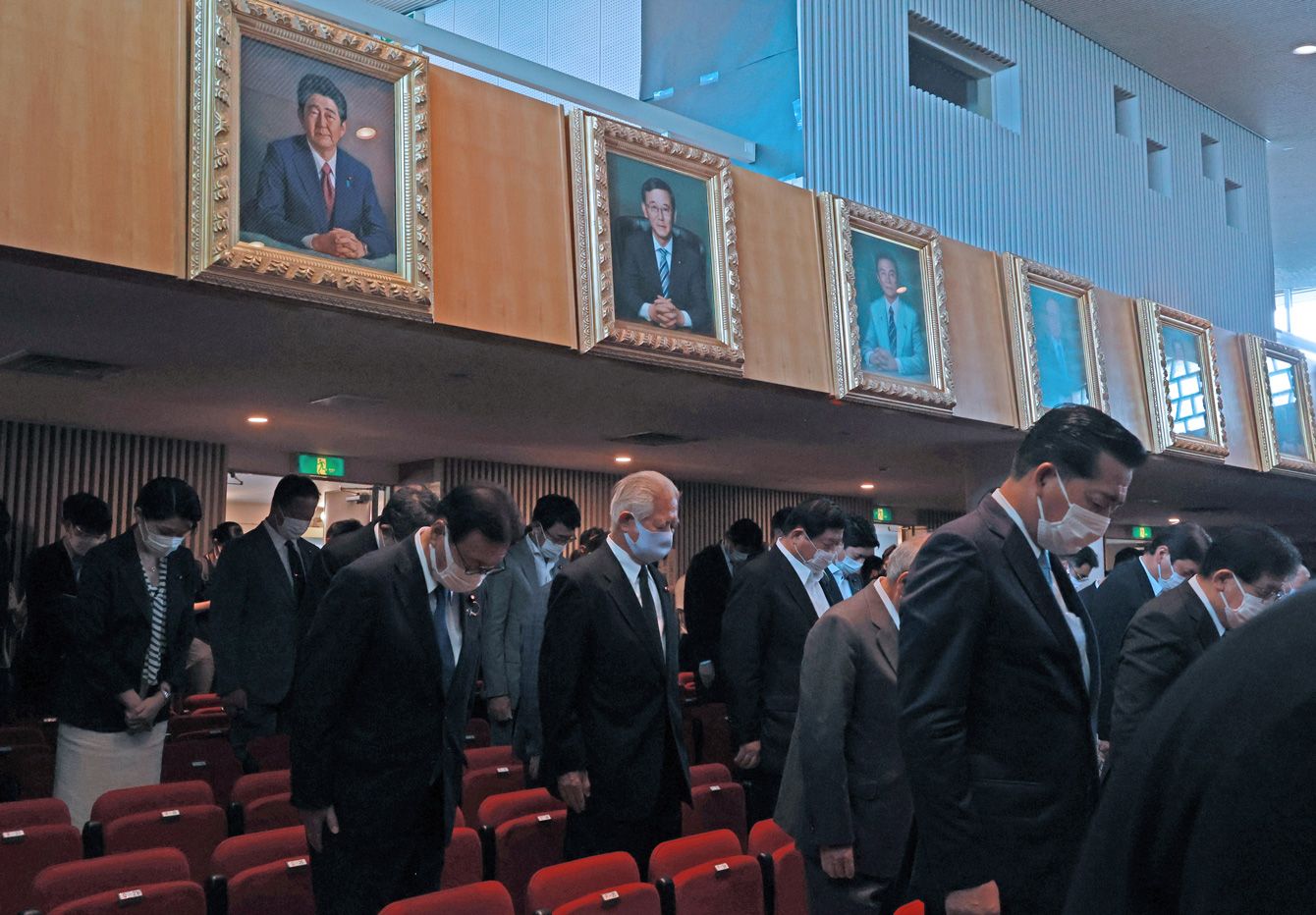 自民党の両院議員総会で故安倍晋三元首相の冥福を祈り、黙とうする議員ら。左上は安倍晋三元首相の肖像画=2022年8月3日、永田町の同党本部