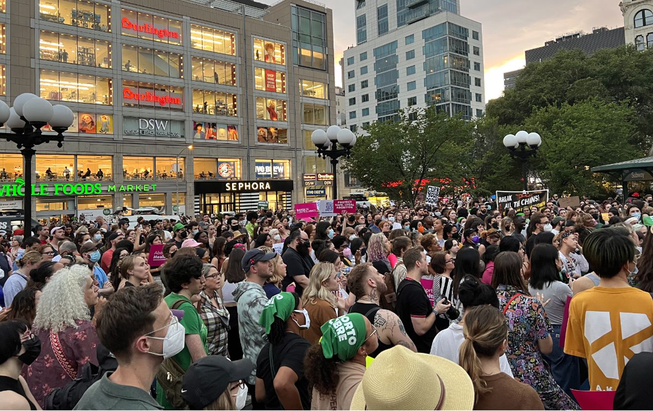 米ワシントンの連邦最高裁前で、中絶をめぐる最高裁判断に抗議する女性たち=2022年6月24日