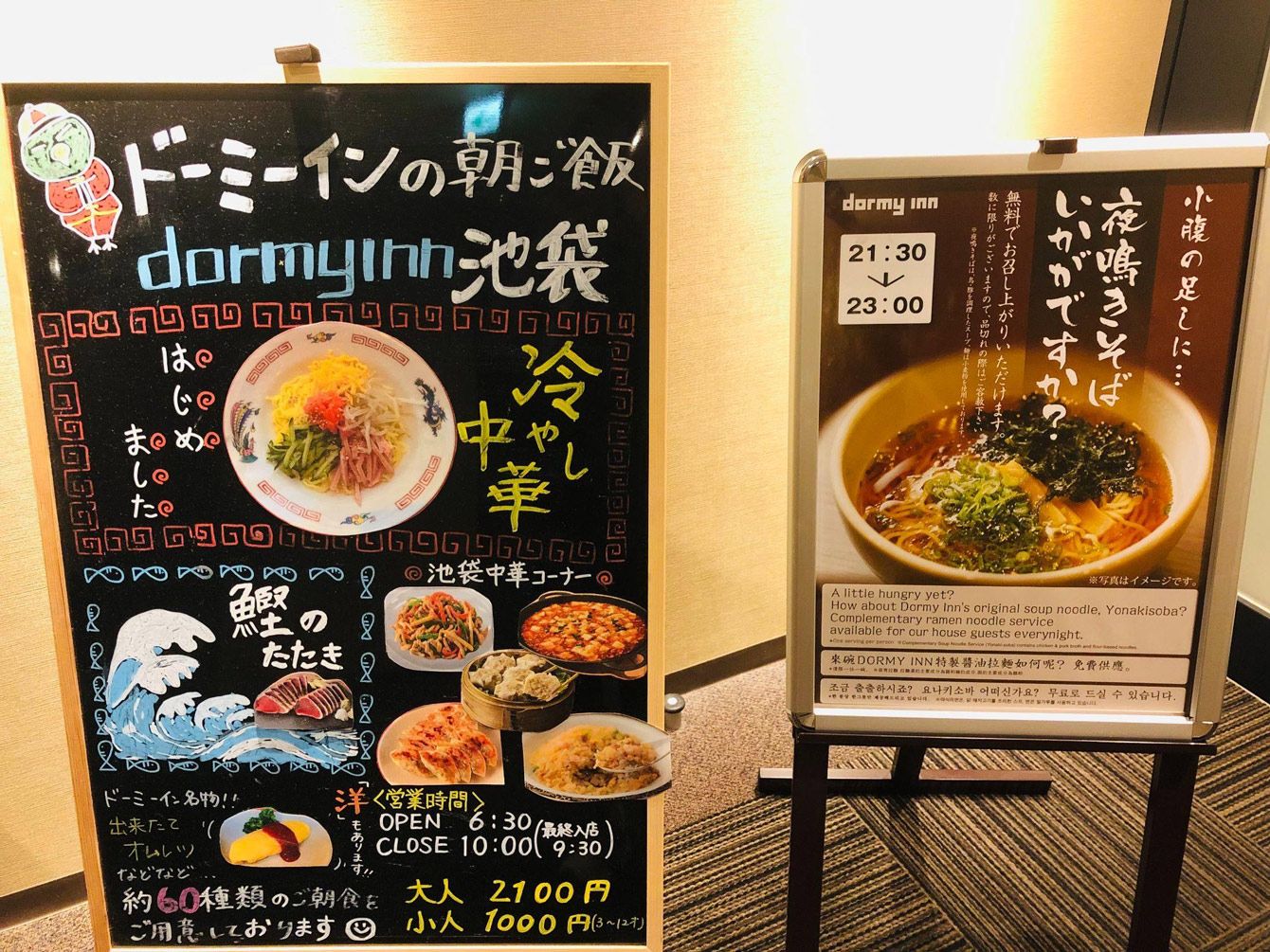 21:30〜23:00の間に無料で提供される夜鳴きそば。「ドーミーインと言えば夜鳴きそば」という評判が立つほど人気となっている。ちなみに23時を過ぎてしまった場合、夜鳴きそばの味に近いカップ麺「ご麺なさい」を深夜1時まで無料配布しているという。