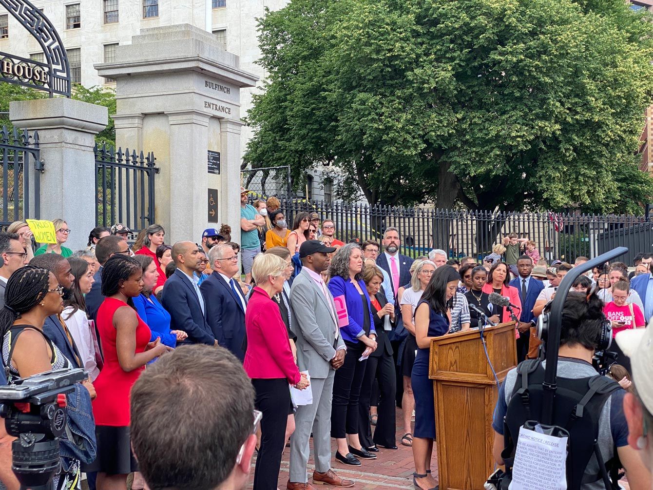 6月24日にマサチューセッツ州議事堂前で開かれた抗議会見。演台前に立つのがアジア系の女性で初めてボストン市長に当選したミシェル・ウー市長。